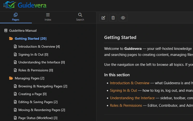 Guidevera helps teams create, review and publish internal knowledge with version history, approval workflows and clear visibility rules.